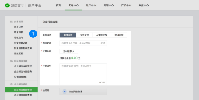 设置入口:【微信支付商户平台】>【交易中心】>【企业微信付款】>【企业微信付款管理】