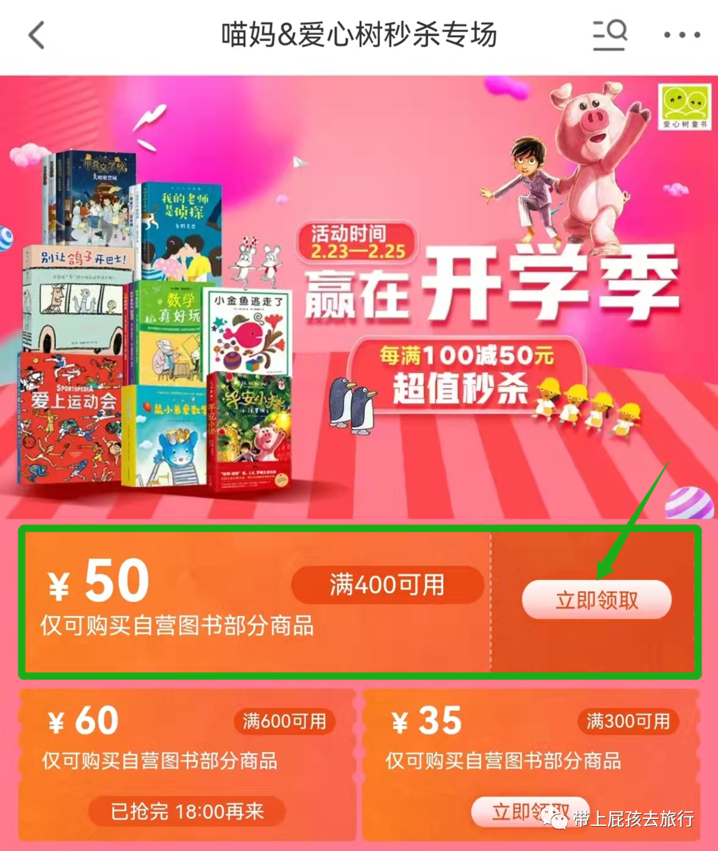 京东商城如何秒杀商品?分享京东秒杀攻略 香香 • 2023年5月4日 16:17:05 • 好文推荐 • 阅读 573 开学季了,总要囤点书😁。喵妈研究了一下,京东新一轮开学季活动来了,满100-50,还可以叠加喵妈为大家独家薅来的400-50大额优惠券!也就是说原价400的书,现在是400-200-50,最后到手只要150!等于不到38折!!太、香、了! 敲黑板:不止是童书,大部分标注“京东自营”的图书都参加这次活动! 活动从今天开始,只到2月25日24时,仅三天,抓紧上车! 用法非常简单: 第一步:扫码进活动页 第二步:领券头图海报下就是满400-50(到手150元)的喵妈独家神券,赶紧戳上去领!300-35(到手只要115元)、600-60券(到手只要240元)也可以根据需要领。 ▲400-50独家券仅2000张,领完无补,手速领走!! 300-35、600-60逢0/9/13/18/20点开抢。 第三步:用券这次的独家券用途很广,大部分“京东自营”书籍都能用!有囤着想买的书,可以一起入。不过最推荐的是二维码页面进入直接能看到的爱心树童书的专场秒杀,毕竟都拿出了高质量的书&日常少见的价! 提醒一下,可以点优惠券后的“去使用”按钮,在“优惠券商品”库里搜索查看是否符合活动条件哈。 最后结算时会根据总额直接减掉优惠金额,页面显示的付款价就是最终到手价。 如何秒杀最香?接下来就为大家讲讲如何秒杀最香,这次的「爱心树童书」的专场秒杀有超多经典童书,从0-2岁到11-14岁,数学启蒙、桥梁书阅读、好习惯好性格培养的经典绘本以及各类科普都有,大家按照孩子的年龄和喜好来选就行了。 凑单攻略直接递到你眼前啦,直接抄,没毛病😏! 如果凑单攻略中,有些书你已经有了怎么办呢?直接替换一本差不多价格的其他书籍就好啦~ 提醒一下:页面上挂着“秒杀价”的书如果没买过,这次一定别错过。这次最划算啦! 01 0-3岁低幼阶段 400元凑单法可以选这些经典童书,到手就差不多是150元的样子。 | 可爱的身体系列(全8册) 畅销10年的经典身体认知绘本,讲的全是宝宝最早认知的事情,比如肚脐、便便、打针、蛀牙等等,早点给TA看这套书,卫生习惯早早养成。 | 小白熊做松饼(全7册) 0-2岁必读的生活绘本,至今已畅销日本40余年。教孩子自立、创新、抗挫和礼仪。每本书还附有为新手爸妈提供的讲读建议。 | 100万只猫 美国第一本真正意义上的绘本,也是绘本史上永恒的经典,获得过凯迪克奖、纽伯瑞奖银奖等等诸多重量级国际大奖! | 小房子 凯迪克金奖作品,入选亲近母语中高儿童分级阅读书目。讲的是一座乡村里的房子,随着社会发展,它周围盖起了新房子,造出了公路和大桥,它会消失么?看完它你会不由自主的感叹,写得太美了! 300元的组合,可以这样选,到手大概是115元。 | 小鹅奇奇中英双语语言启蒙绘本(全13册) 这是一套给0-3岁宝宝看的双语启蒙绘本,包含12册双语故事绘本和1册互动纸板书。主角是十只小鹅,它们一起生活在一个农场里,小故事里有非常多重复和有韵律的句子贴,听着听着就会说了,还搭配识读单词表,很好用。 | 五味太郎:高高兴兴出门了(全3册) 专为0-3岁宝宝创作的出行主题绘本。通过三个萌趣小动物出门的经历,描述宝宝爱探索的成长天性,贴近幼儿的生活,引起每个小小孩的共鸣。看这画风,实在萌化了😍。 如果你还没给娃看过「鼠小弟系列」,600元凑单可以考虑这么凑,到手是240元: | 可爱的鼠小弟 | 鼠小弟的小背心 “鼠小弟”系列是爱心树童书的当家好书,中文版至今销量已超1500万册。 《可爱的鼠小弟精装版1-6》,包括鼠小弟系列的经典“小背心”和“吃苹果”等故事,画得好看故事好玩,结局还非常惊喜,激发孩子想象力和创造力。 《鼠小弟的小背心(全8册)》是一个连续剧故事,入选中国儿童分级阅读书目。里面讲述了属于鼠小弟,也属于小朋友的小失落、小欢喜、小幽默……鼠小弟小小的世界里蕴含着人生大大的道理! | 小猫当当1-10(全10册) 这是一套畅销了45年的经典绘本,一只俏皮可爱、元气满满的小猫,10个贴近生活的故事,讲的是小猫当当,也是每个孩子的真实缩影!怎么呵护孩子纯真的天性,自然养育好性格、好习惯?跟TA一起书里找答案吧。 | 牙虫大搬家 一本让孩子主动刷牙的神奇绘本!蛀牙是怎么形成的?刷牙为什么很重要?牙虫是怎么破坏牙齿的?直观看完这一切,所有孩子都会主动开始和牙虫作斗争的刷牙游戏。 02 3-6岁幼小衔接 幼小衔接时段的凑单攻略,大家可以这么做: | 鼠小弟爱数学 | 鼠小弟爱数学(4~6岁) 超人气数学启蒙绘本,可以从入园一直看到小学。趣味故事引出数学概念,奇妙而亲切。 《鼠小弟爱数学》,适合2~4岁,每本书=一个迷人的故事+一个数学概念+一组趣味活动;《鼠小弟爱数学4~6岁》,适合4~6岁,会讲到“跳数、立体图形、货币换算”这些难度更高的数学概念。 | 儿童安全365:安全启蒙绘本 最经典的儿童安全教育绘本,128个儿童安全知识点,各类场景全覆盖,防诱拐、防范性侵害,教会孩子365天的自我安全保护。 | 蜡笔小黑(全4册) 这是一套好玩儿的艺术启蒙绘本。有故事看,还能学到蜡笔、刮画、水彩、橡皮泥……各种玩法,以及如何乐观融入集体生活。 | 鸭子骑车记(全2册) 这是《大卫不可以》作者、凯迪克大奖得主大卫·香农的又一经典作品。带孩子进行一场充满笑声的冒险之旅,启迪孩子萌发大胆尝试和探索的勇气。 | 我的创意绘本五味太郎50%+25% 这是风靡全球30年创意思维艺术启蒙涂鸦大书,