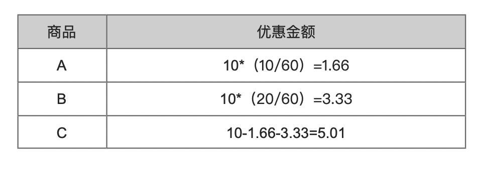 - 存在多个商品时,按照从小到大金额顺序排列依次计算,避免某一个金额较大时进行四舍五入将其他商品优惠进行分摊。