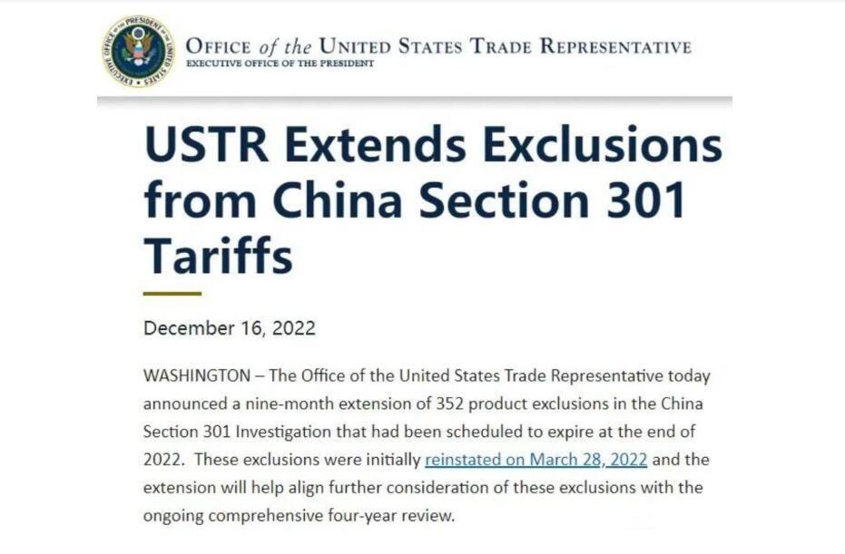 美国贸易代表办公室近日发布声明,原定于在2022年年底到期适用于352项中国商品的关税豁免将延长九个月,至2023年9月30日。