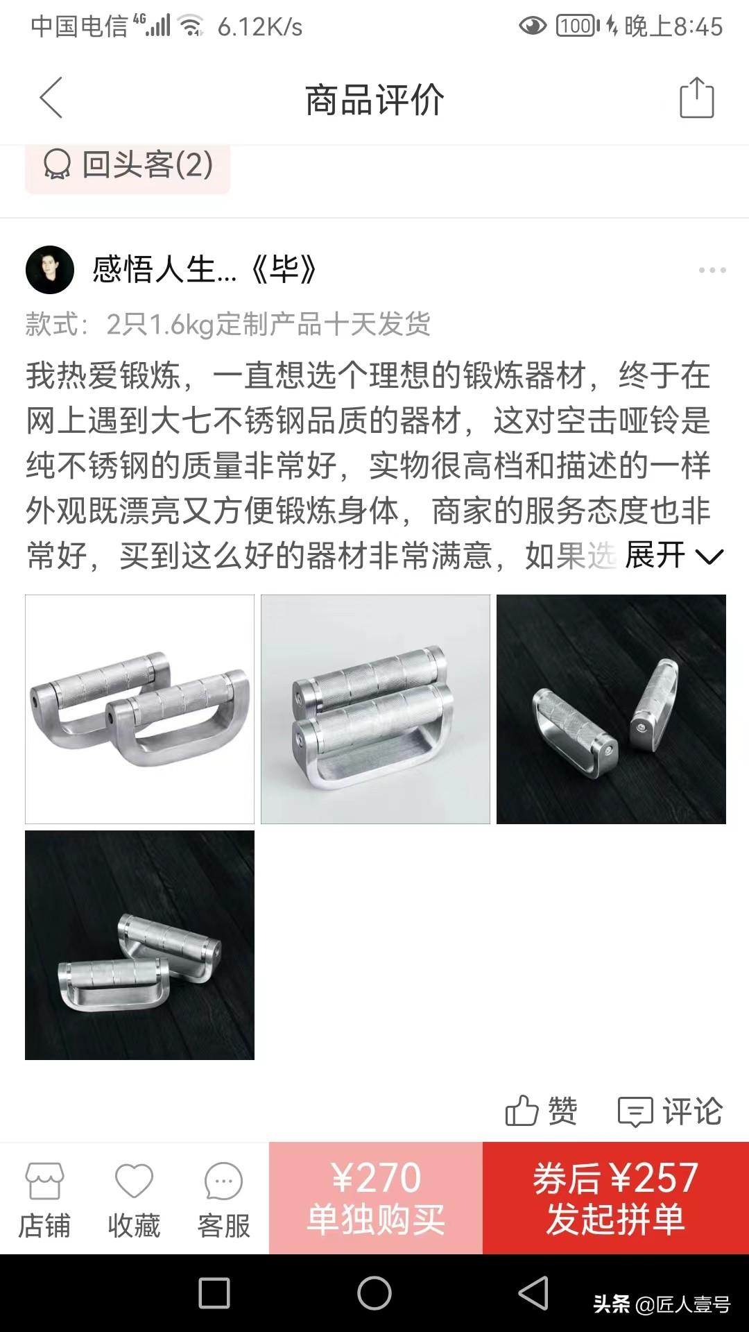 2、卖家秀:卖家秀的评价对象是商店里正在销售的商品。拍摄相关产品照片后,进行后期制作并配以文字介绍,以此吸引顾客购买。例如,这种常用的哑铃设备